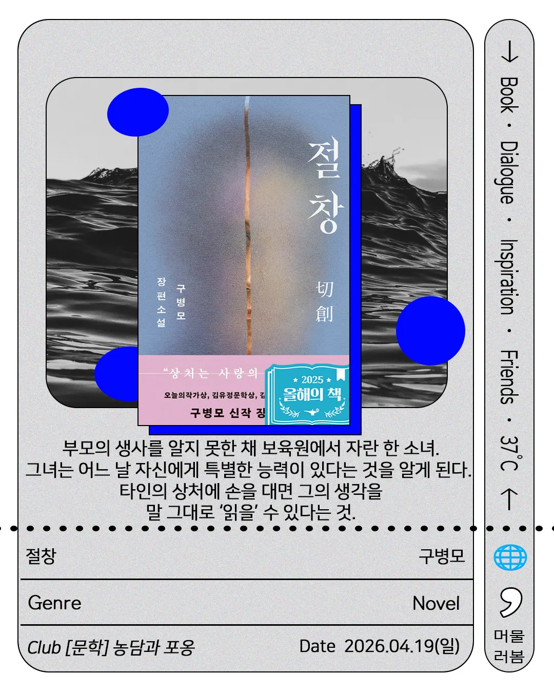[문학-농담과 포옹] 은 문학의 가치를 믿고, 경험하고 싶은 분들 모두 환영합니다. 우리는 그저 광활한 문학의 세계를 맘껏 누비면 그만입니다. 그런 동안 한껏 충만해진 나를 발견해봅시다.