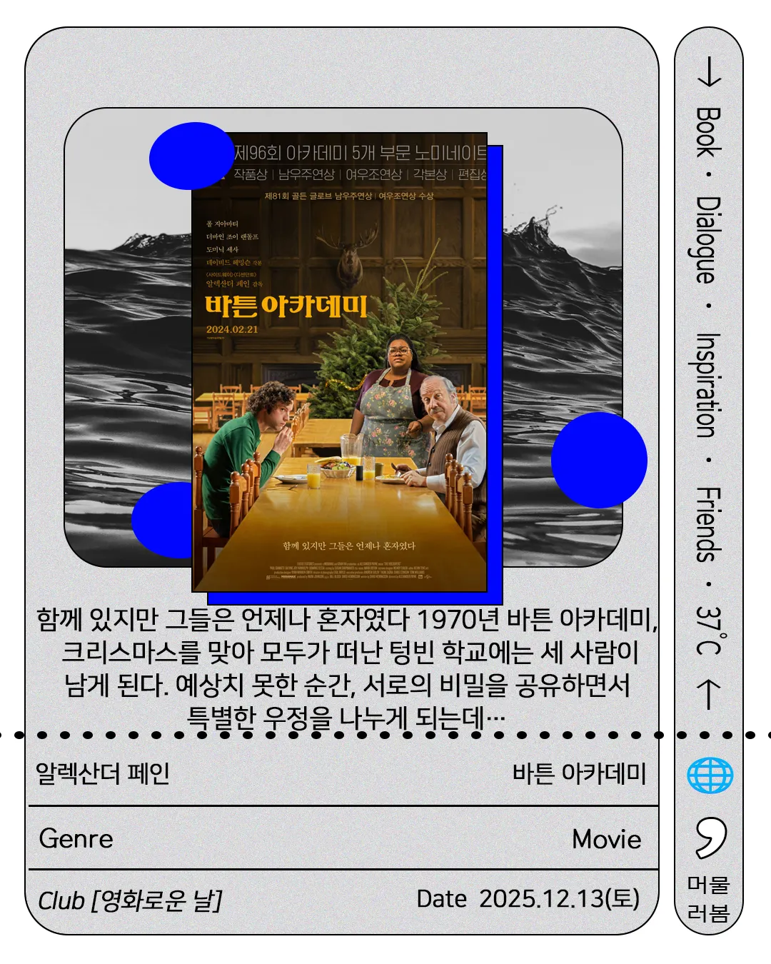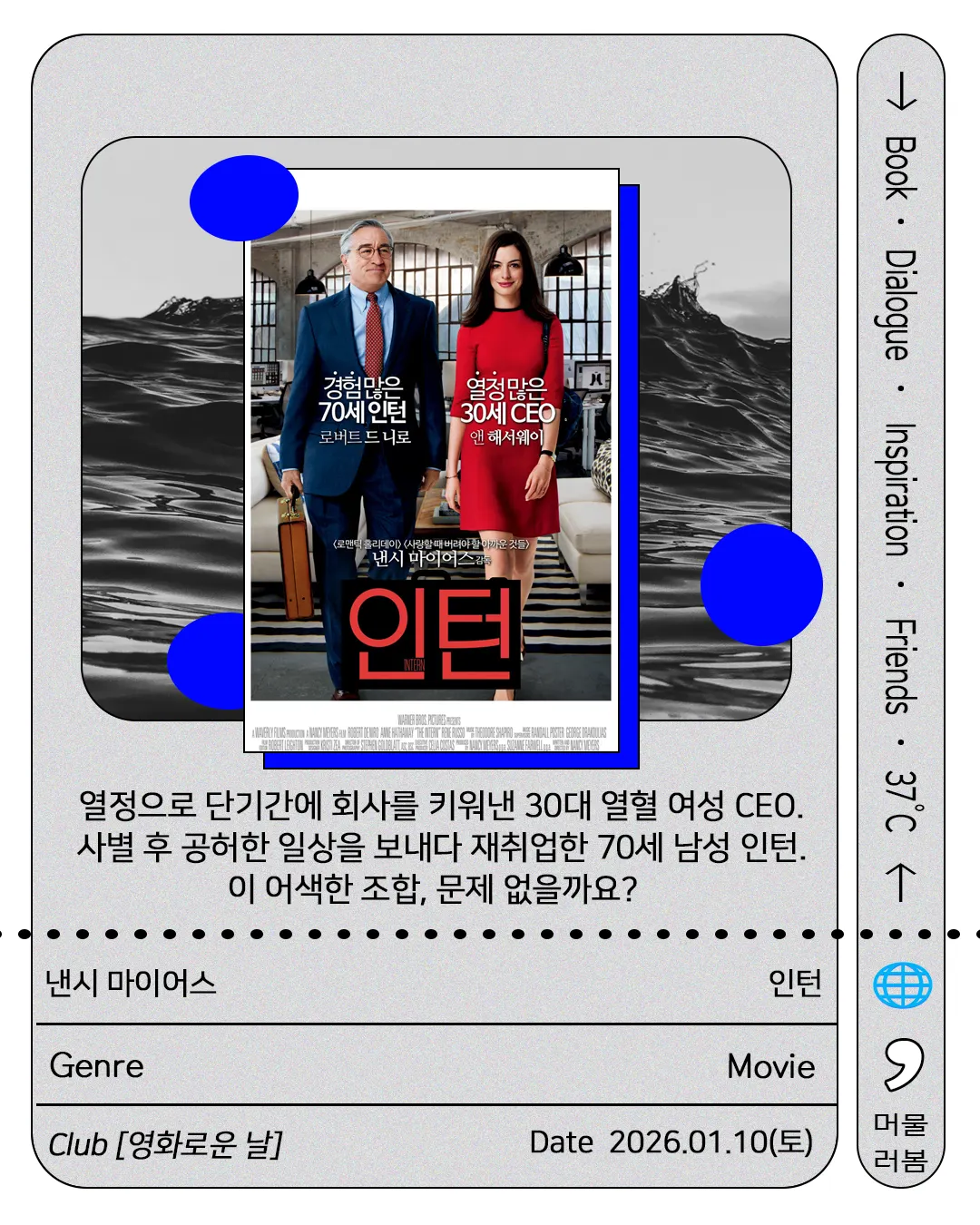 영화를 좋아한다는 건, 등장인물의 이야기에 관심이 있다는 것이고, 이는 곧 ‘사람’을 향한 온정이 있음을 뜻하는 게 아닐까요? 우리 만나서 즐거운 시간 함께 만들어봐요