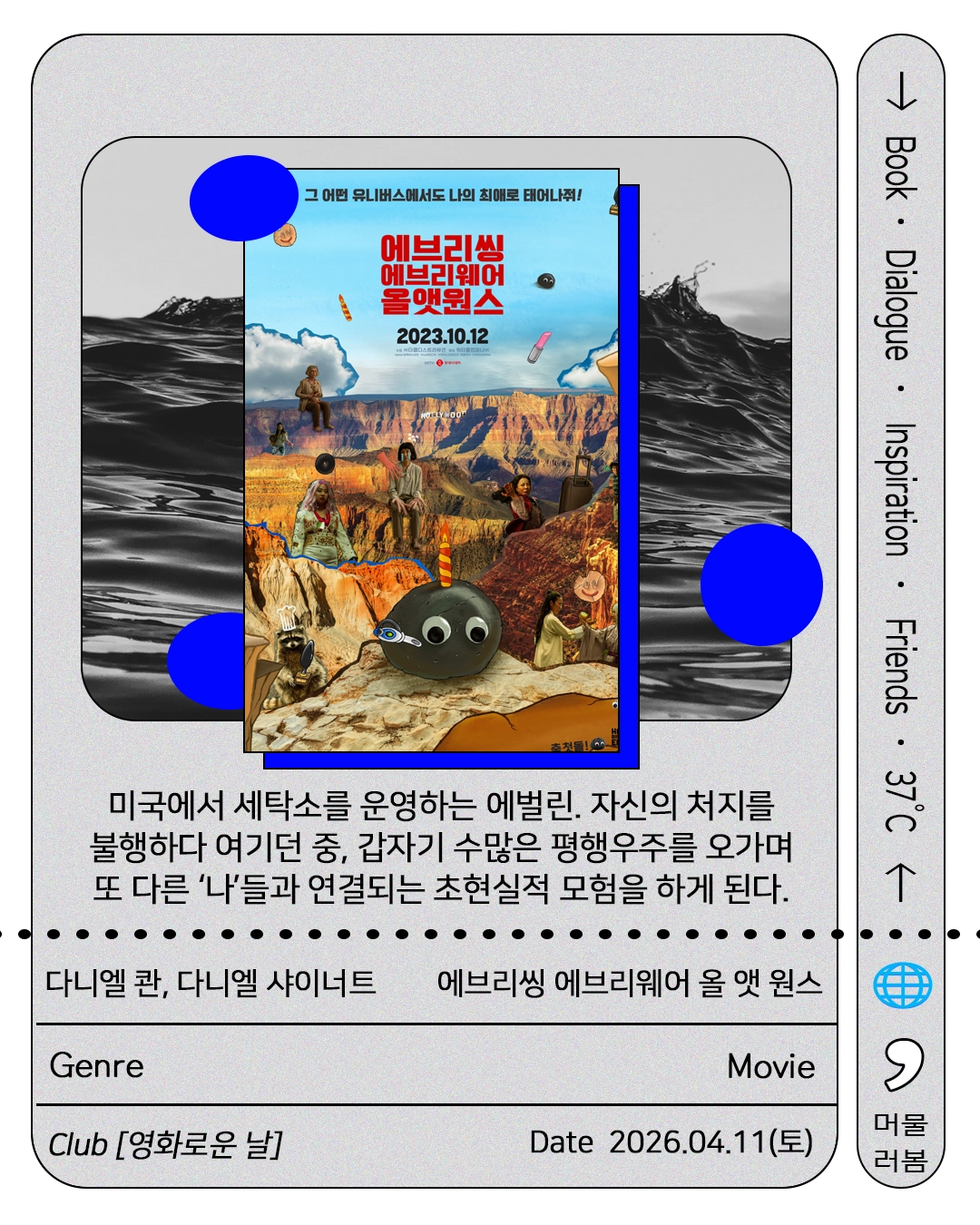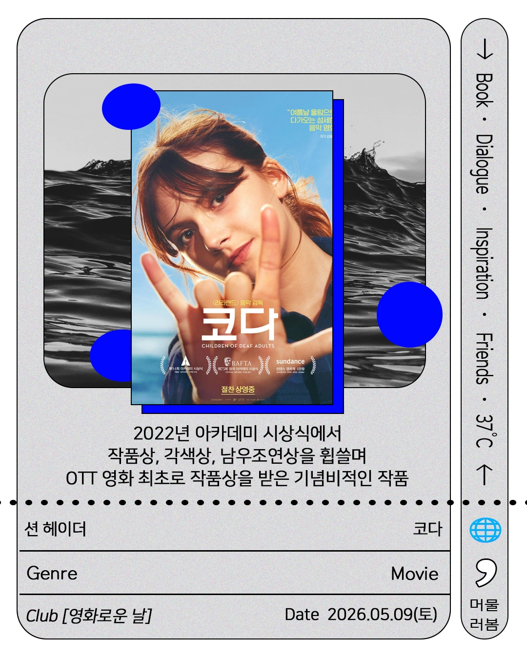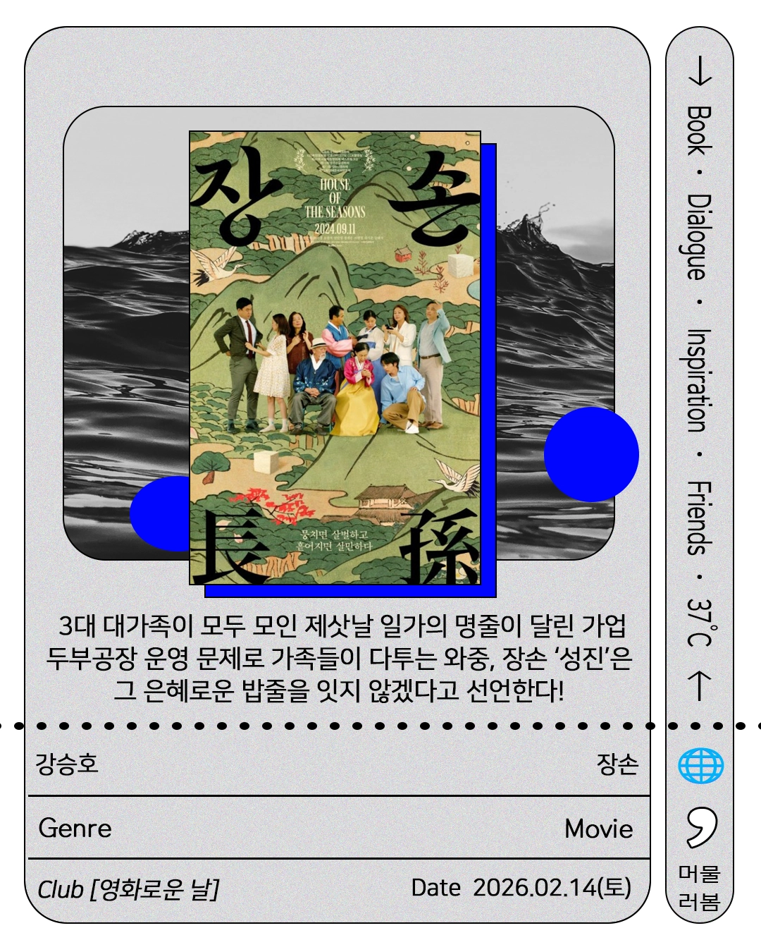 영화를 좋아한다는 건, 등장인물의 이야기에 관심이 있다는 것이고, 이는 곧 ‘사람’을 향한 온정이 있음을 뜻하는 게 아닐까요? 우리 만나서 즐거운 시간 함께 만들어봐요
