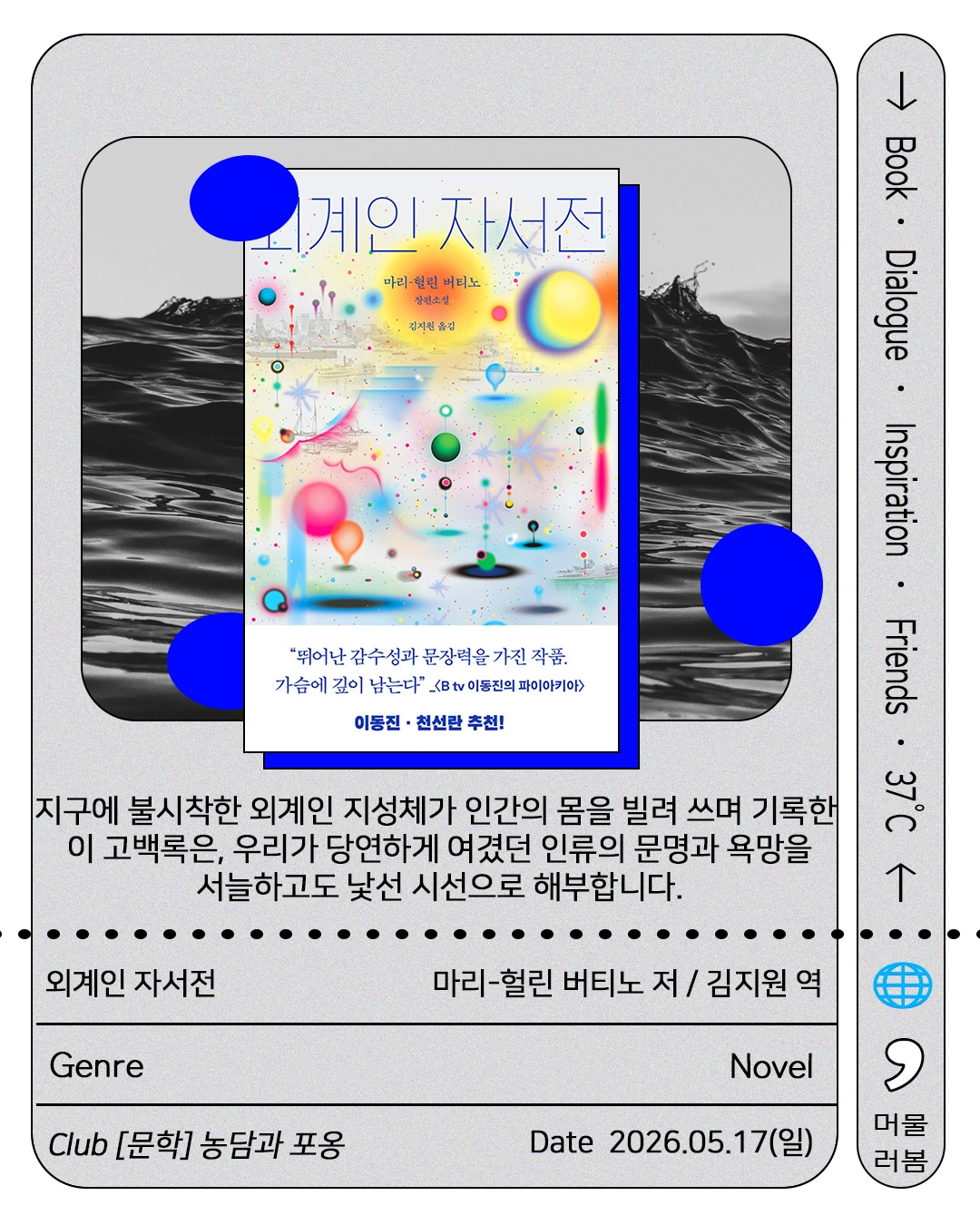지구에 불시착한 외계인 지성체가 인간의 몸을 빌려 쓰며 기록한 이 고백록은, 우리가 당연하게 여겼던 인류의 문명과 욕망을 서늘하고도 낯선 시선으로 해부합니다.