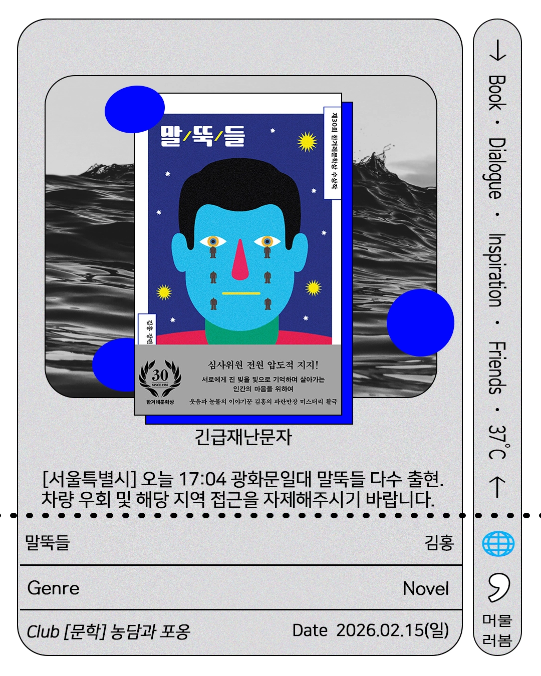 한편, 풀썩 안길 품이 돼주는 문학은 어떤 면에서 ‘도피’일 수도 있습니다. 그러나 결코 도피에 그치지 않습니다. 한껏 움츠렸던 몸에 힘을 불어넣어서 기어코 ‘밖을 향하게’ 한다는 점에서요. 그러니 문학은 단순히 회피의 시간이 아닙니다. 가쁜 숨을 몰아쉬는 회복의 시간입니다.