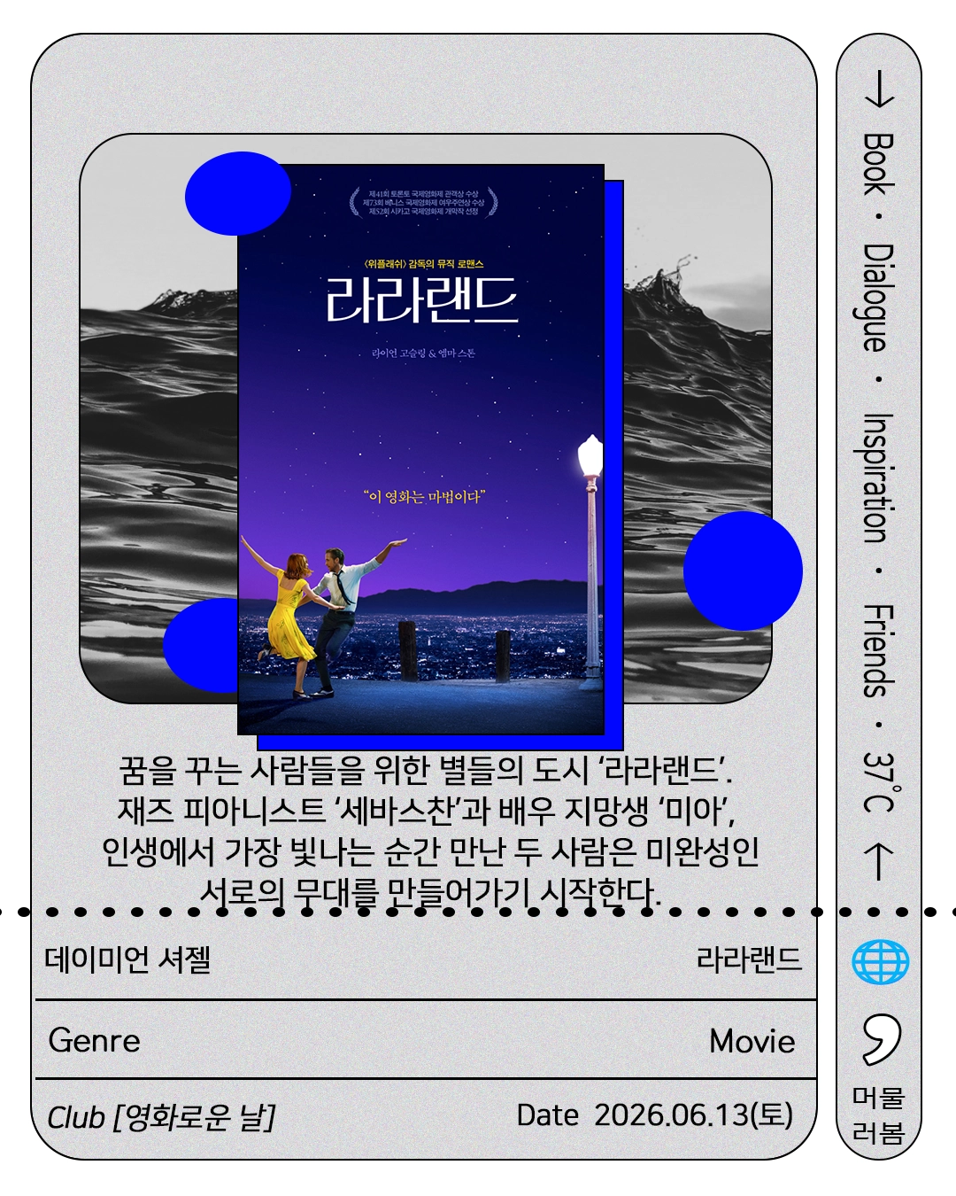 영화를 좋아한다는 건, 등장인물의 이야기에 관심이 있다는 것이고, 이는 곧 ‘사람’을 향한 온정이 있음을 뜻하는 게 아닐까요? 우리 만나서 즐거운 시간 함께 만들어봐요